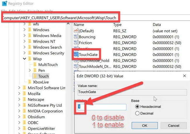 - Change the value of the entry to 0. If you want to enable the touch screen again, change the TouchGate value from 0 to 1 or simply delete the TouchGate entry.