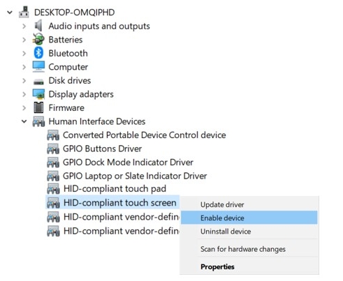 - Right-click on the HID-compliant touch screen device in the list.
