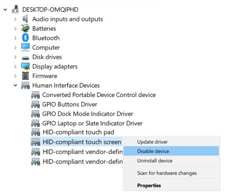 Note: If you can’t find the “Disable device” option in the pop-up menu, then touch screen is turned off already.