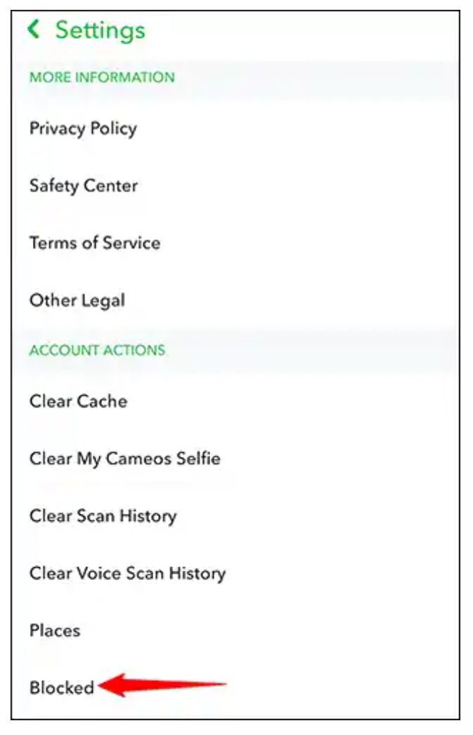 4. Scroll to the bottom to find the Blocked option under Account actions category. Tap on it to see the list of people you have blocked on snapchat.