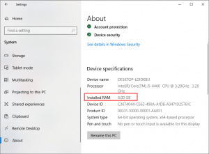 - Click on the Start button on your PC. Go to Settings, and then go to the About section on your computer to check the RAM availability. Click System
